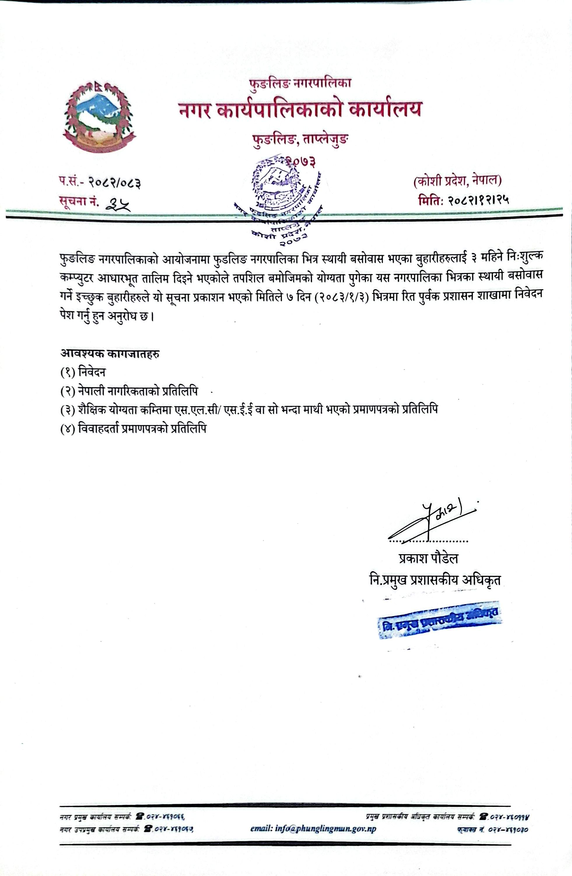 Home » फुङलिङ नगरपालिकाको आयोजनामा फुङलिङ नगरपालिका भित्र स्थायी बसोबास भएका बुहारीहरुलाई ३ महिने नि:शुल्क कम्प्युटर आधारभूत तालिम दिईने सम्बन्धी सूचना!!!!!