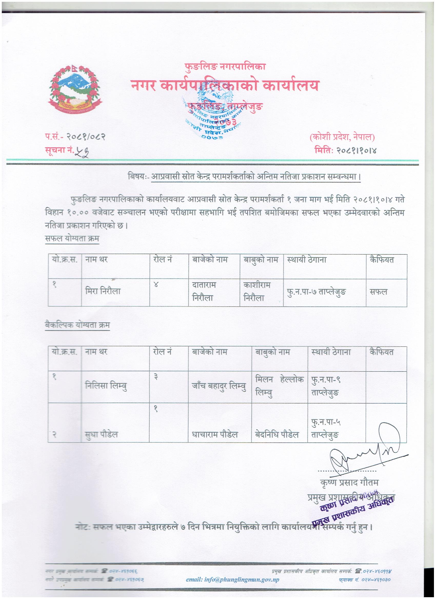 Home » आप्रवासी श्रोत केन्द्र परामर्शकर्ताको अन्तिम नतिजा प्रकाशन सम्बन्धमा ।